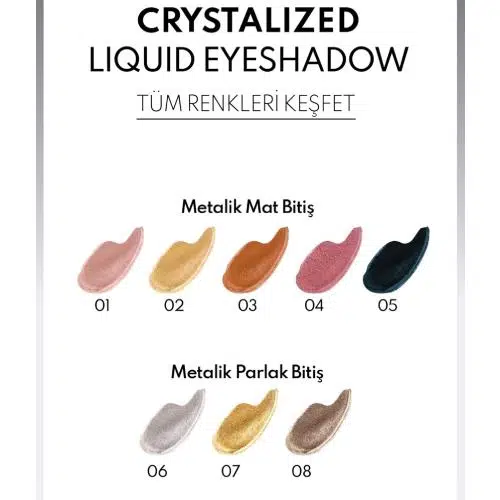 Crystalized Liquid Eyeshadows, pürüzsüz uygulama ve uzun süre kalıcı etkisiyle göz makyajınıza yeni bir boyut kazandırır. Hafif yapısı ve çizgilenme karşıtı formülüyle tüm gün boyunca kusursuz görünüm sağlar. Gliserin ile zenginleştirilmiş formülü, cildinizi nemlendirirken 8 çarpıcı ve yüksek pigmentli renk seçeneği sunar. Metalik mat ve parlak bitiş alternatifleriyle ve kolay uygulama sağlayan fırçası ile tarzınızı tamamlayın.